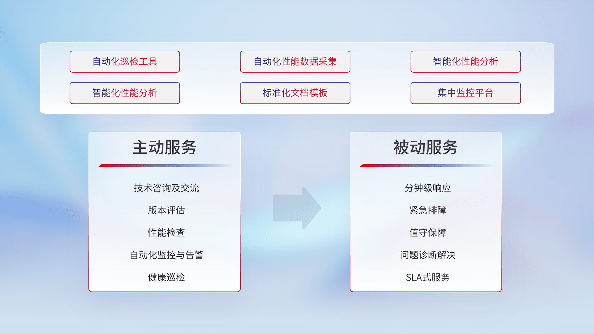 智能化工具和标准化文档,,,,保障服务质量,,提供主动服务(包含技术咨询、、、、版本评估、、性能检查、、、自动化监控与告警、、健康巡检)和被动服务包含(分钟级响应、、、紧急排障、、值守保障、、、、问题诊断解决、、SLA服务)。。